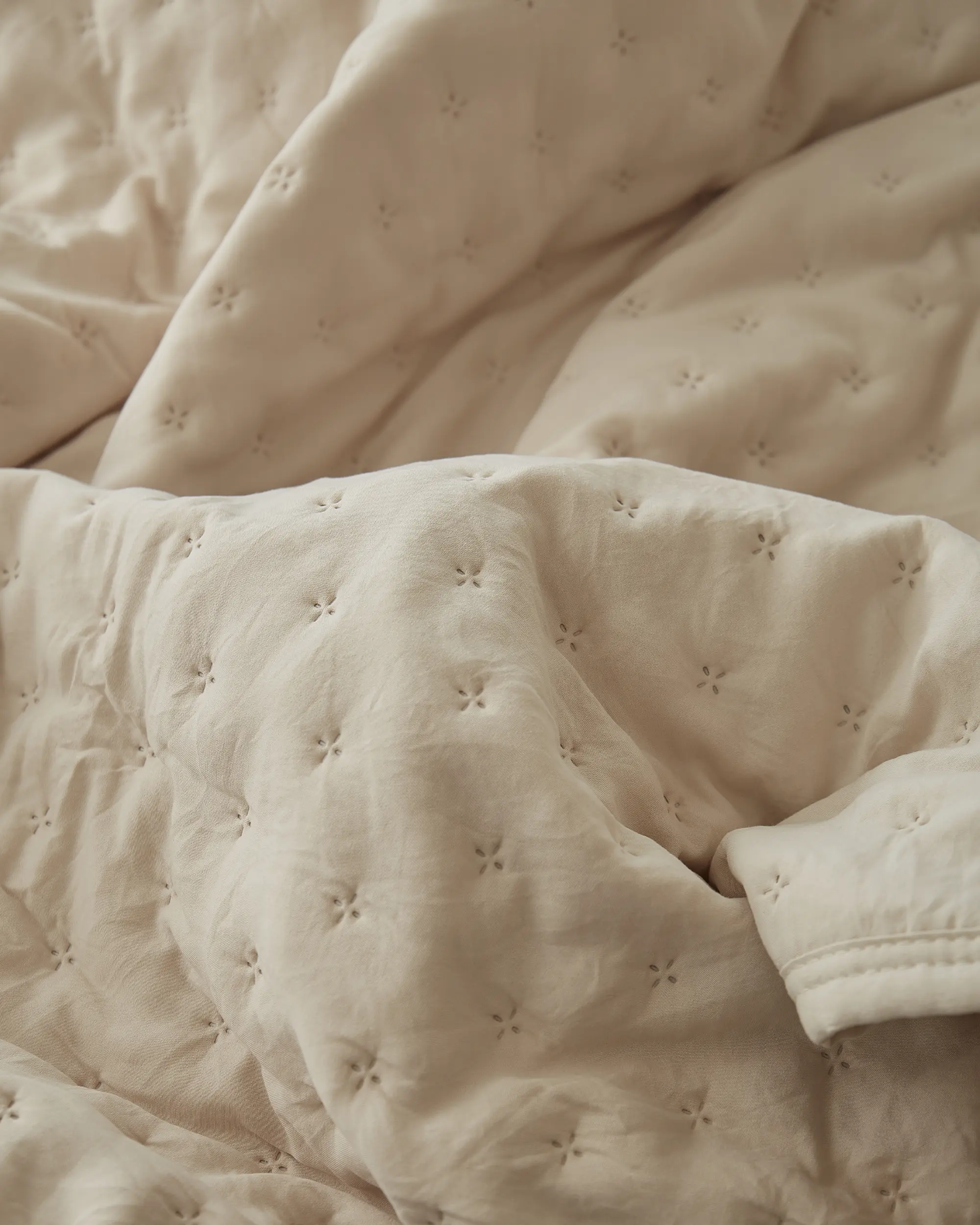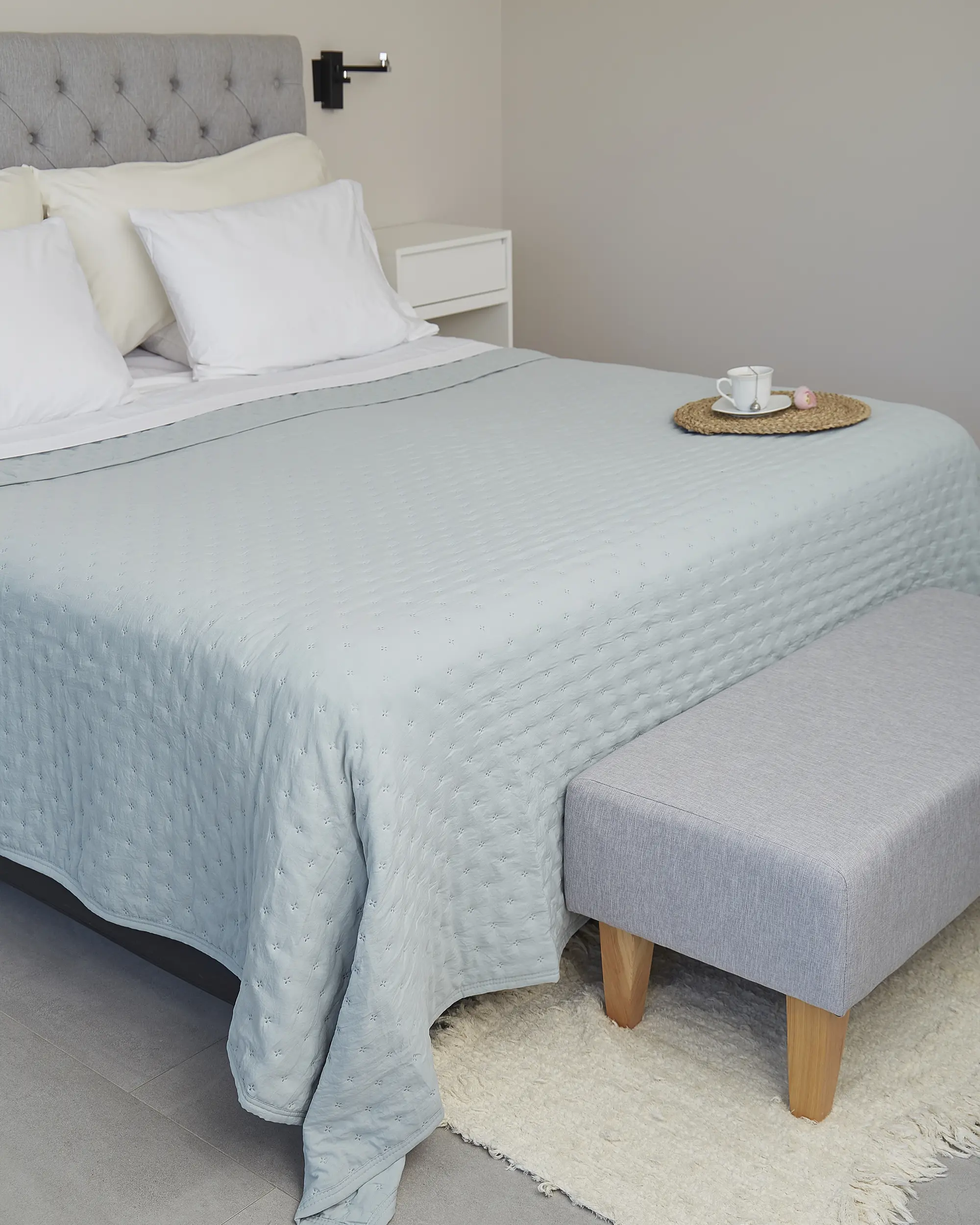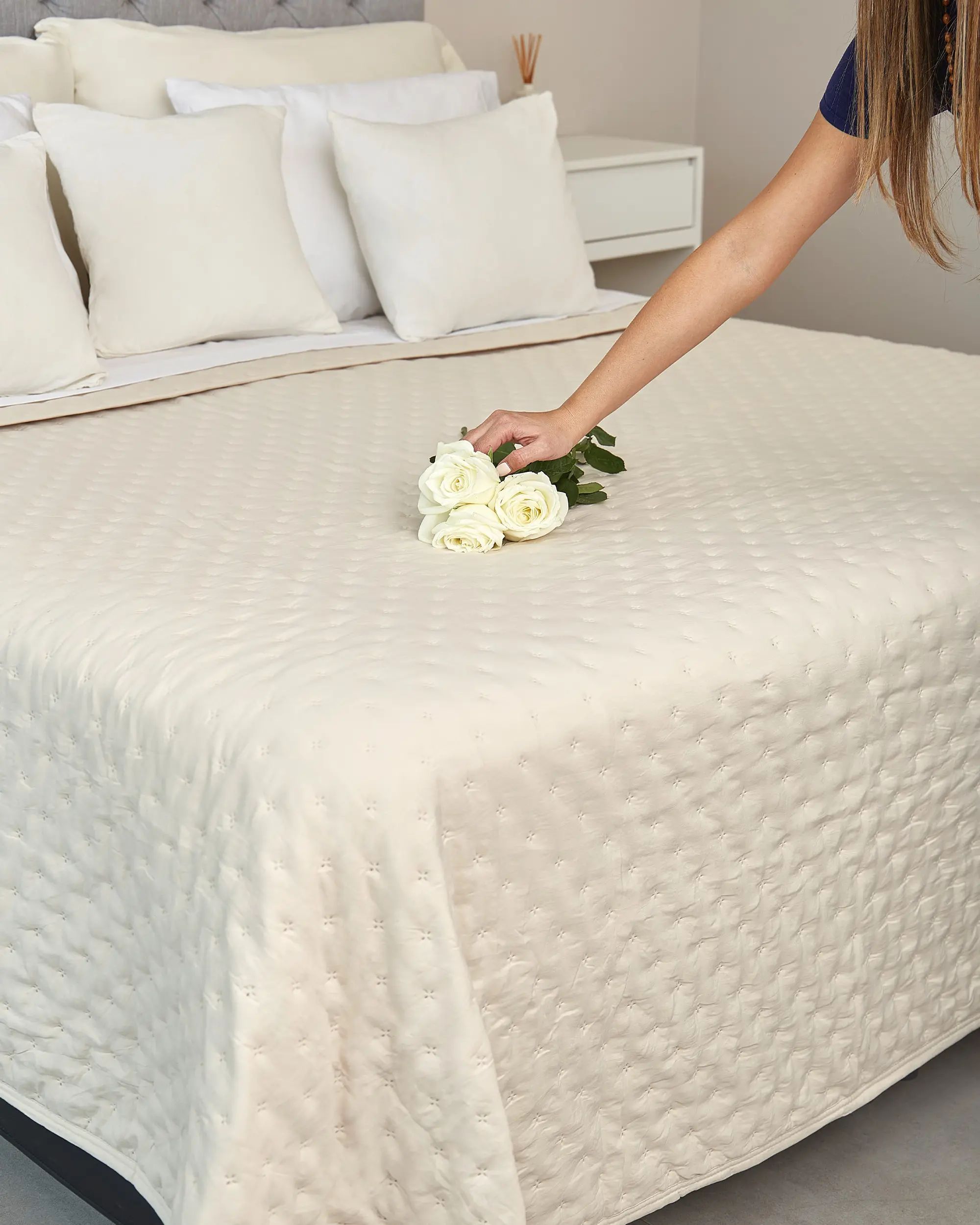 Cubrecama reversible confeccionada con un tejido que posee un proceso de prelavado que le da un efecto suave como el algodón. El producto tiene un hermoso acabado con cinta al bies.