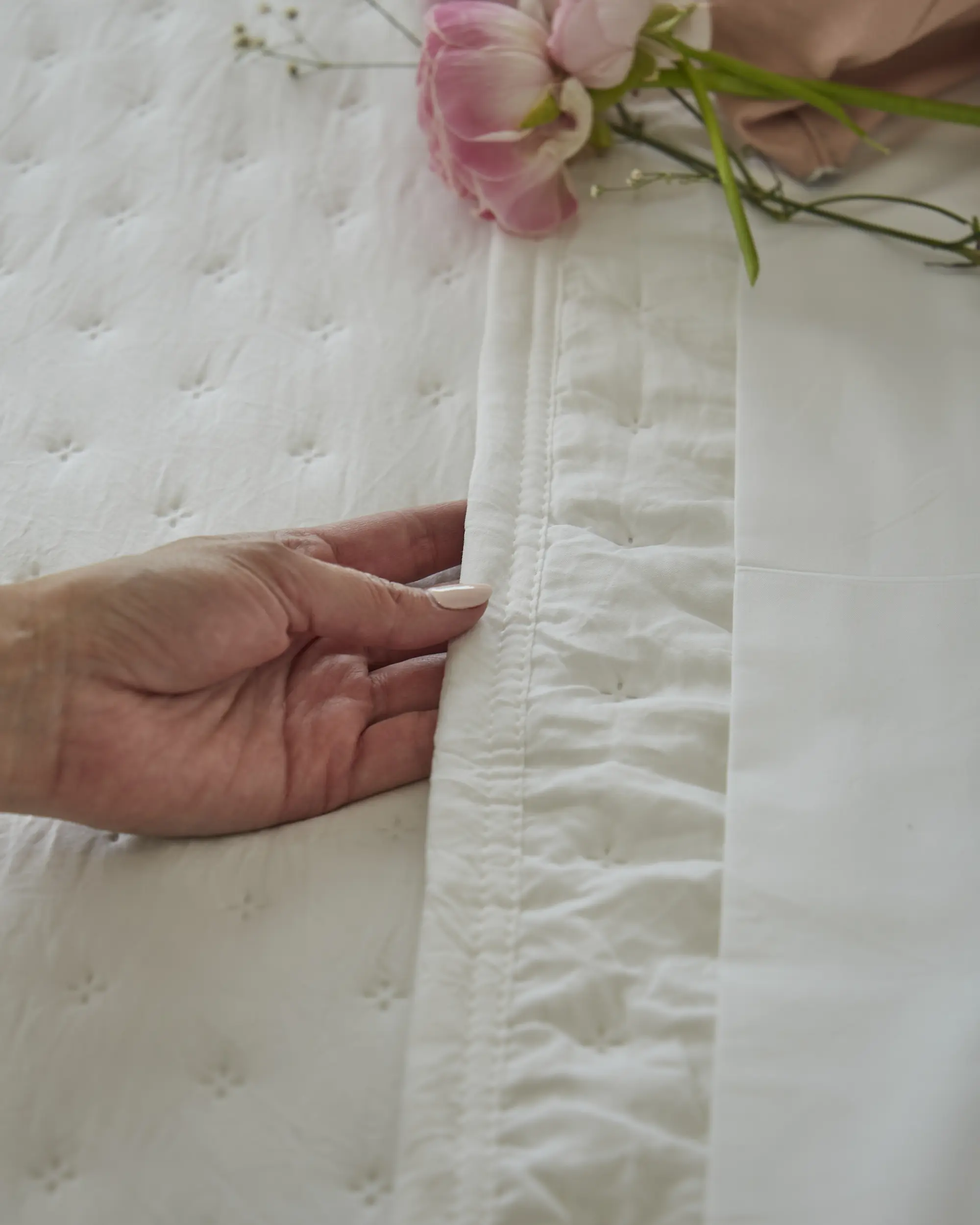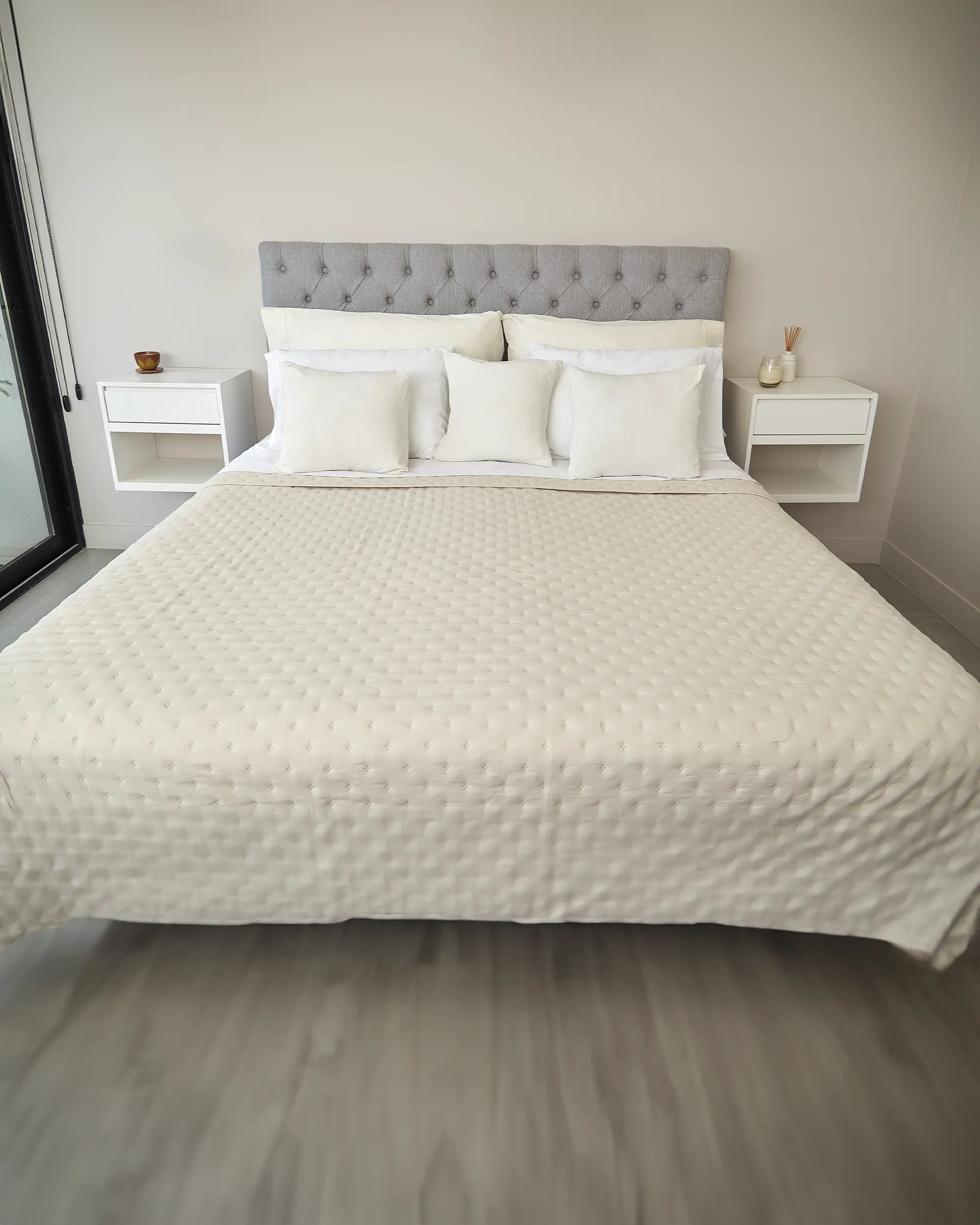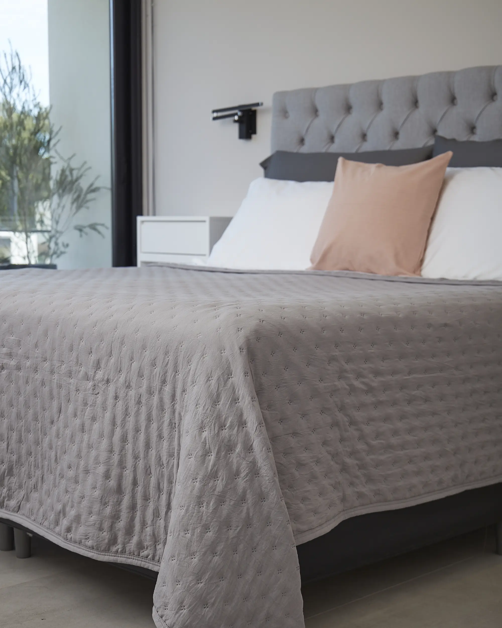 Cubrecama reversible confeccionada con un tejido que posee un proceso de prelavado que le da un efecto suave como el algodón. El producto tiene un hermoso acabado con cinta al bies.